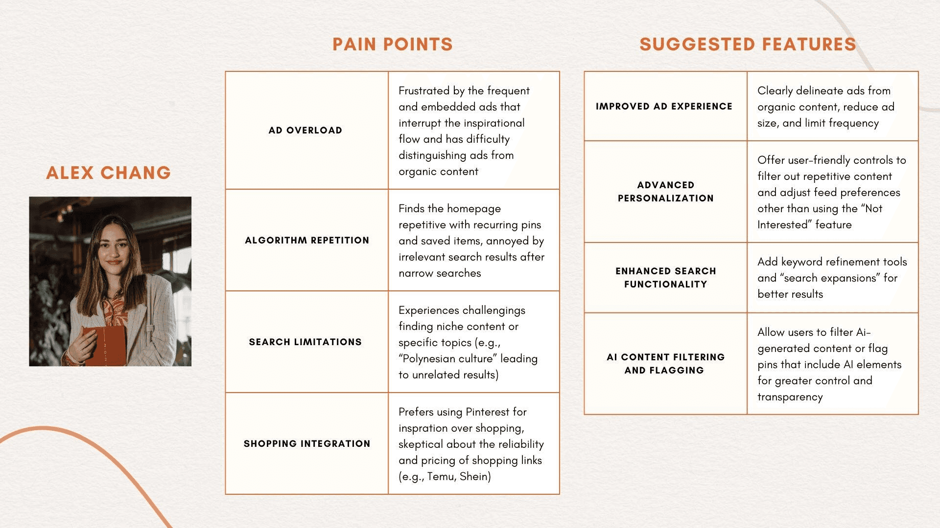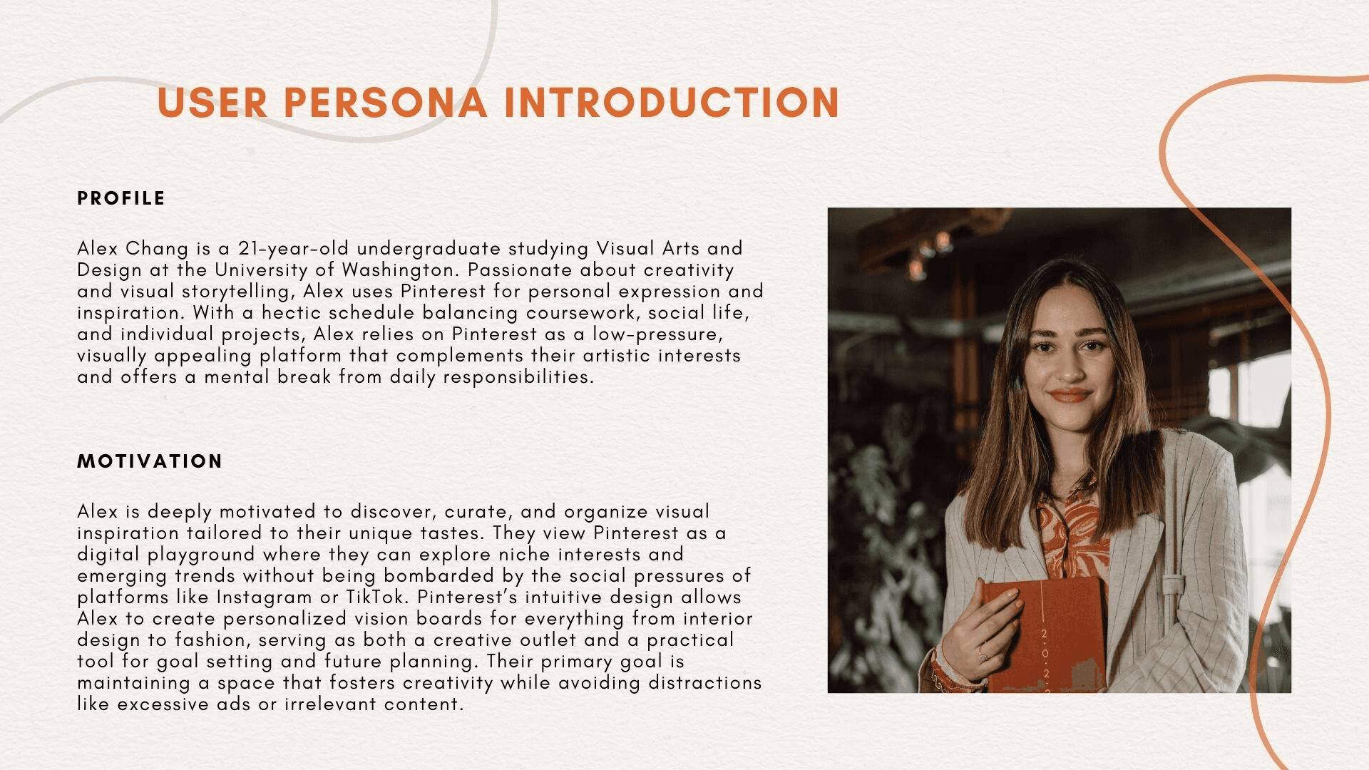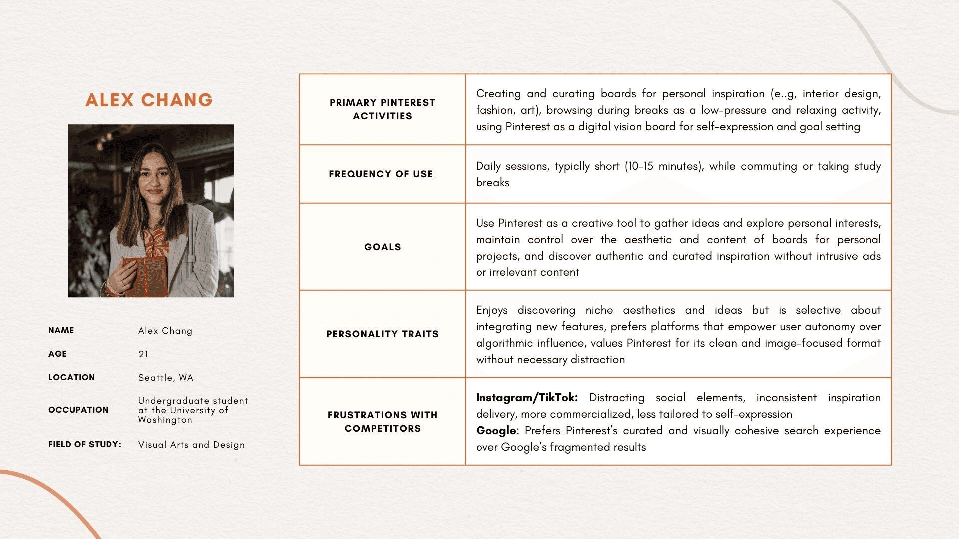 While browsing Reddit comments provides some insight into user frustrations, it lacks the depth of understanding that comes from directly interacting and talking with users. Observing complaints online doesn’t compare to walking through a day in the life of a Pinterest user or hearing firsthand about their motivations and pain points, so I decided to interview University of Washington students to dive into their experiences with Pinterest. Through these conversations, I developed the user persona of Alex Chang, a creatively inspired undergraduate.
