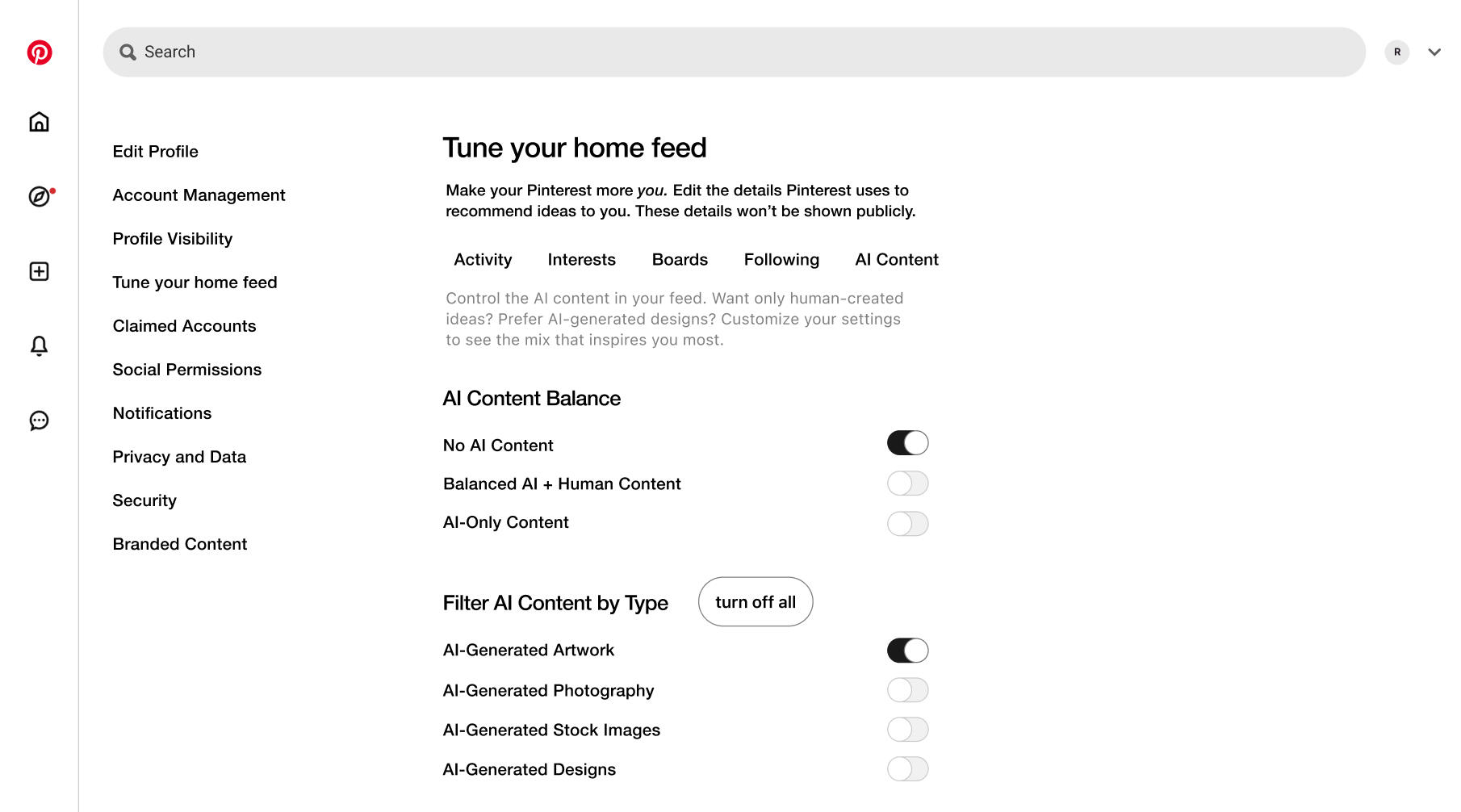 No AI Content → Completely removes AI-generated Pins from feed and search.