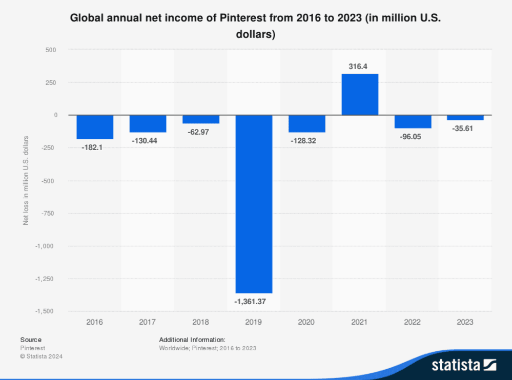 However, despite having an interesting product, Pinterest struggled to find its footing in monetization during its early stages. Previously, the company ignored revenue generation for the product, meaning monetization features rolled out slowly, and it was too late to catch up to other social media monetization strategies. Only now is Pinterest focusing on providing features for advertisers, including AI and automation campaign features, personalized promotions, and deal ad modules. As you can see in the chart below, Pinterest is still struggling to break even on net income.